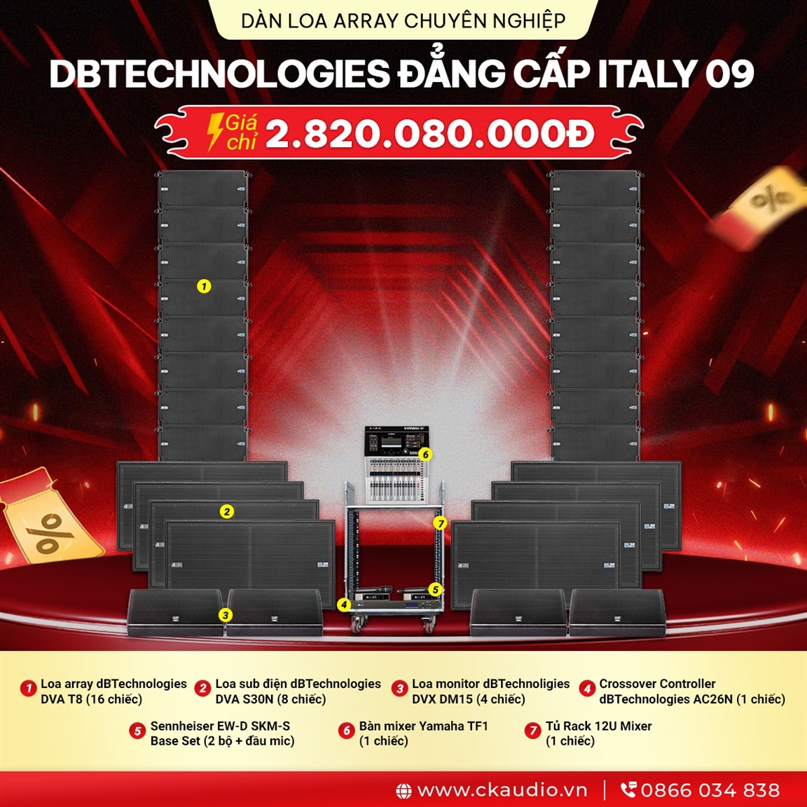 Dàn Loa Array Chuyên Nghiệp dBTechnologies Italy 09 mang đến cho bạn hệ thống âm thanh tuyệt vời với các thiết bị hàng đầu như loa array DVA T8, bàn mixer Yamaha TF1, loa sub DVA S30N, bộ micro không dây Sennheiser EW-D và nhiều thiết bị khác. Hãy liên hệ ngay với chúng tôi 0866 034 838 để sở hữu bộ dàn âm thanh chất lượng cao này và nâng tầm sự kiện của bạn!